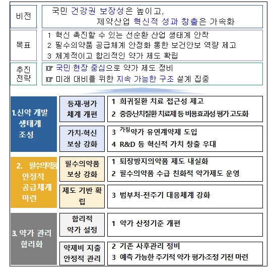 정부는 제약산업 혁신을 촉진하고, 환자의 치료 접근성은 높이면서도 약제비 부담은 완화하기 위한 약가제도의 종합적인 개선을 추진한다.