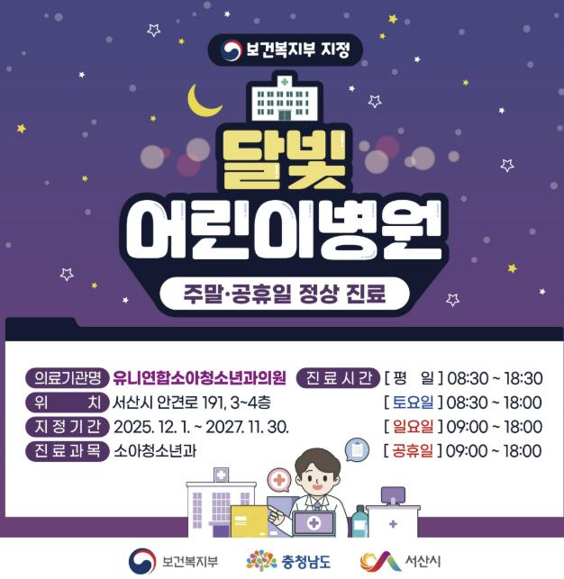 시는 지난 2021년부터 충청남도 서산의료원을 통해 운영 중인 ‘서산시 영유아 야간진료센터’와 함께 관내 소아 진료 여건을 향상할 것으로 전망했다.