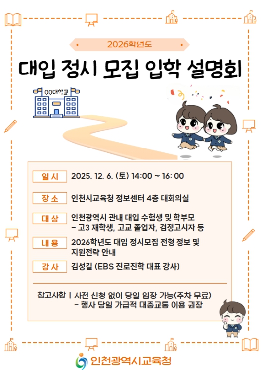 설명회는 인천시교육청 정보센터 대회의실에서 오후 2시부터 약 두 시간 동안 진행되며, EBS 진로진학대표강사가 강연을 맡아 정시모집 지원 전략과 정보를 제공한다.