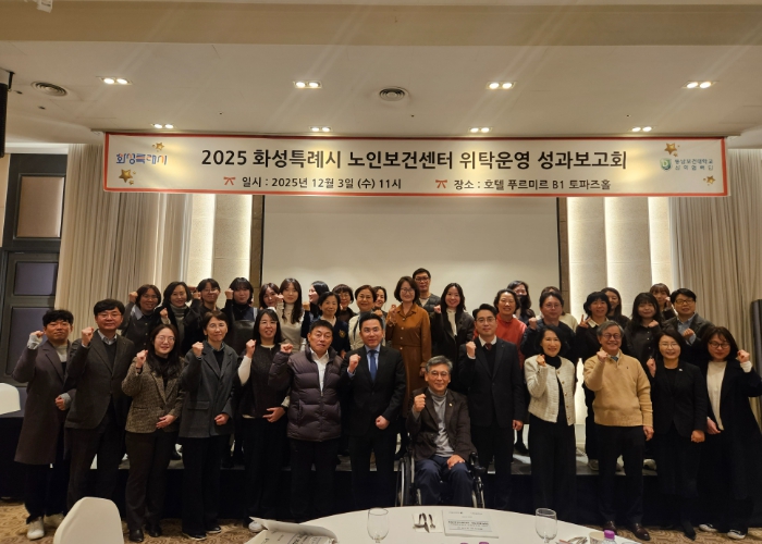 ![]() 3일 열린 화성특례시 노인보건센터 성과보고회에서 참석자들이 기념 촬영을 하고 있다 |