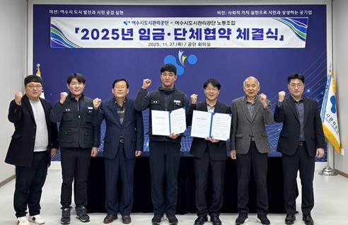 ![]() 지난 27일 여수시도시관리공단 회의실에서 열린 2025년 임금협약식에서 공단 이사장과 노사 교섭위원 등이 기념 촬영을 하고 있다. |