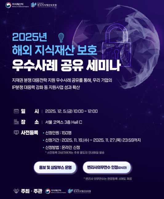 ![]() 2025년 해외 지식재산 보호 우수사례 공유 세미나 포스터 |