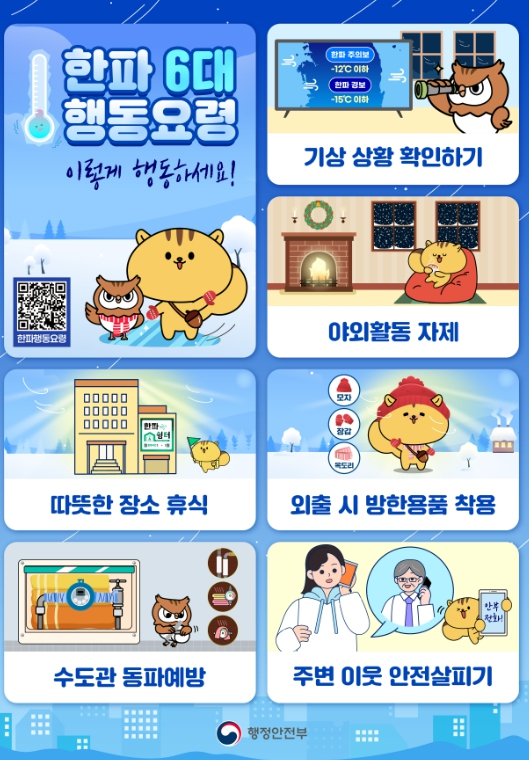 겨울철 한파 대비 국민행동요령은 △기상 상황 확인하기 △야외활동 자제 △따뜻한 장소 휴식 △외출 시 방한용품 착용 △수도관 동파예방 △주변 이웃 안전살피기 등이다.