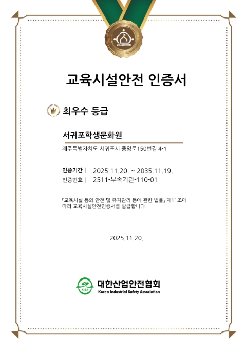 ![]() 교육시설 안전 인증 최우수 등급 인증서 |