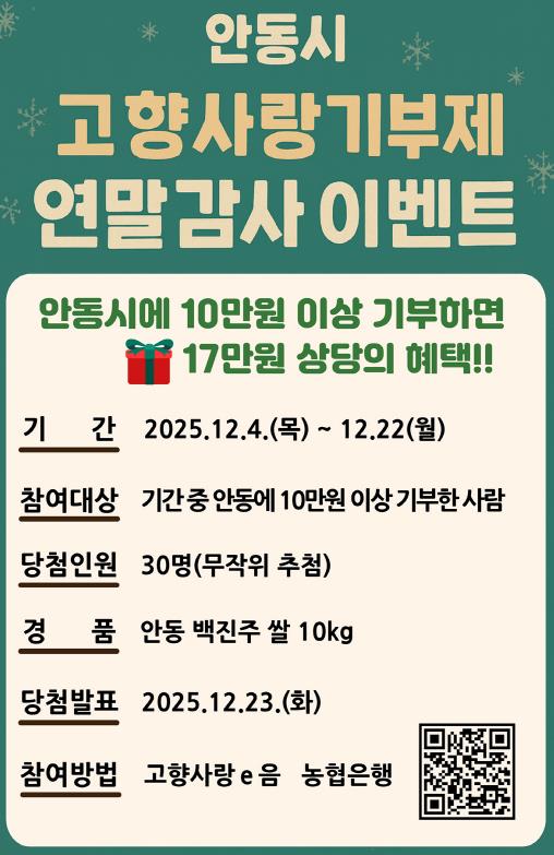 ![]() 안동시, 연말정산 대비 고향사랑기부 감사 이벤트 마련 |