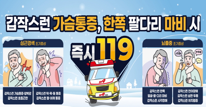 ![]() 예산군보건소 겨울철 큰 일교차로 심근경색과 뇌졸중 발생 위험이 높아짐에 따라 조기 증상 인지와 빠른 119 신고가 회복률을 좌우하는 가장 중요한 대응이라고 강조했다. |
