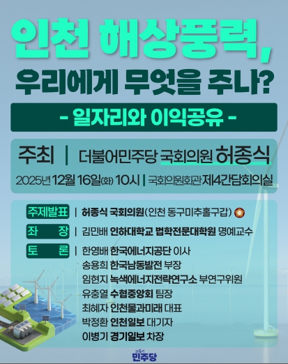 더불어민주당 허종식 국회의원(국회 기후에너지환경노동위원회, 인천 동구미추홀구갑)은 12월 16일 오전 10시, 국회 의원회관 제4간담회의실에서 '인천 해상풍력, 우리에게 무엇을 주나? : 일자리와 이익공유' 정책토론회를 개최한다고 밝혔다.