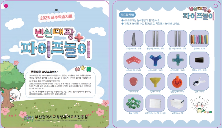 올해는 유치원 현장의 의견을 반영한 ‘2025 변신대장 파이프놀이+’ 자료를 개발해 부산 지역 공·사립 유치원과 유아학급이 설치된 특수학교에 보급했다. 이번 자료는 사선형·Y자형·6구형 소켓 등 연결 요소를 다양화하고, 팝튜브 등 추가 구성품을 확장해 기존 ‘2023 변신대장 파이프놀이’의 활용 범위를 넓힌 확장판이다.