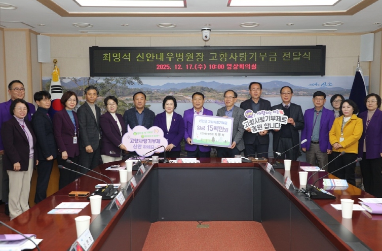 ![]() 17일, 고향사랑기부금 전달식 후 신안군 관계자들과 최명석 신안대우병원장이 기념 촬영을 하고 있다. |