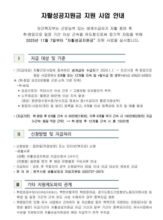 신청 기준은 2024년 이후 자활사업에 참여한 사람 중 자활근로 이외 근로소득을 받으며 6개월 이상 근속하거나 탈수급한 사람이다.