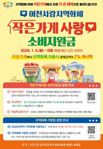아울러 이천시는 가맹점 기준 확대에 따른 대형 점포 중심 소비 쏠림을 방지하고 관내 작은 가게를 보호하기 위해 ‘작은가게사랑 소비지원금’ 제도를 병행 추진한다. 2026년부터 시행되는 ‘작은가게사랑 소비지원금’은 연매출 3억 원 이하 지역화폐 가맹점에서 결제 시 결제금액의 7%를 캐시백으로 지급하는 제도로, 1인당 월 최대 5만 원 한도 내에서 월별 예산 소진 시까지 운영된다. 현재 이천시 지역화폐 가맹점 중 약 73%가 작은 가게로, 이번 소비지원금 제도는 골목상권 활성화와 소상공인 경영 안정에 실질적인 도움이 될 것으로 전망된다.