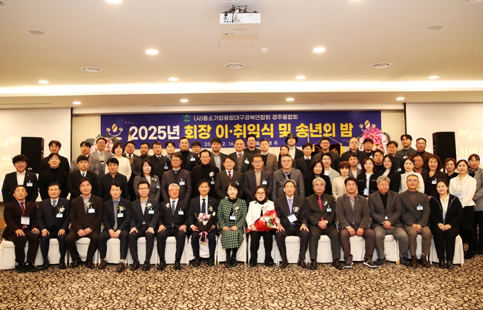 ![]() (사)중소기업융합대구경북연합회 경주융합회는 16일 힐튼호텔 경주에서 제6,7대 회장 이,취임식과 송년의 밤 행사를 개최하고, 참석자들이 기념촬영을 하고 있다 |