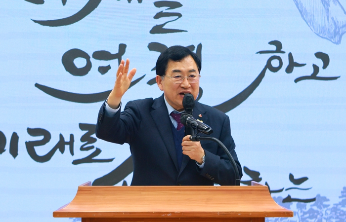 ![]() 주낙영 경주시장이 19일 시청 대회의실에서 열린 2040년 경주시 도시기본계획 시민참여단 도시 미래상 전달식에서 인사말을 하고 있다 |