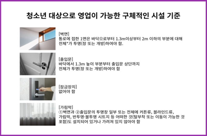![]() 시설 기준(청소년 출입·고용금지업소 결정 고시)(2023-25호 요약/출처: 성평등가족부 블로그) |