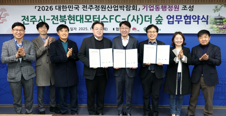 전주시와 전북현대모터스FC(단장 이도현), 사단법인 더숲(대표 정명운)은 23일 시청 3층 소회의실에서 ‘2026 대한민국 전주정원산업박람회’ 기업동행정원 조성을 위한 업무협약을 체결했다.