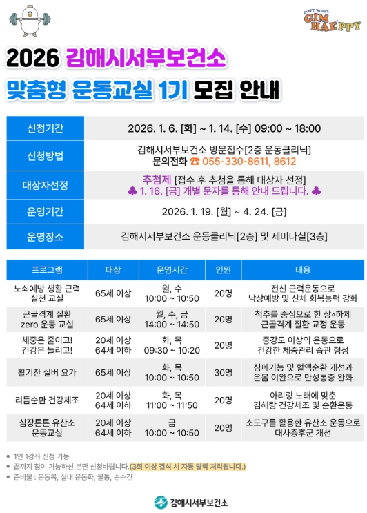 ![]() 김해시서부보건소 『2026년 맞춤형 운동교실 1기』 모집 안내 |