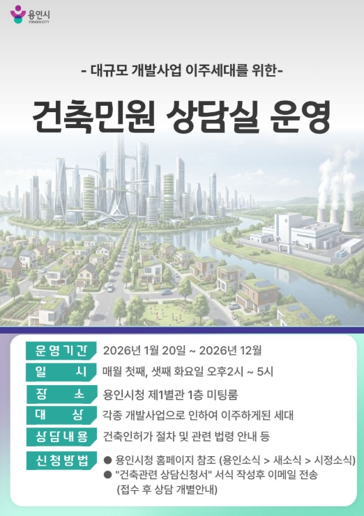 ![]() 용인특례시가 개발사업에 따른 이주세대를 위해 '맞춤형 건축민원 상담 서비스'를 운영한다. |