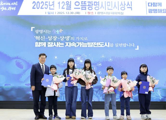 ![]() 박승원 광명시장이 지난 30일 시청 대회의실에서 열린 '2025년 12월 으뜸광명시민시상식'에 참석해 ‘2025 광명시 독서마라톤 대회’ 5·10㎞코스 어린이 완주자들과 기념사진을 촬영하고 있다. |
