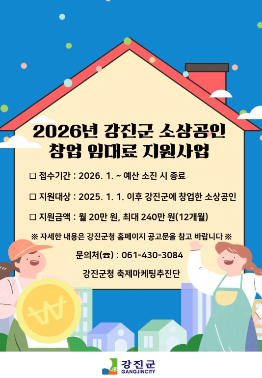 ![]() 강진군에서 창업하면 최대 240만 원 임대료 지원! |