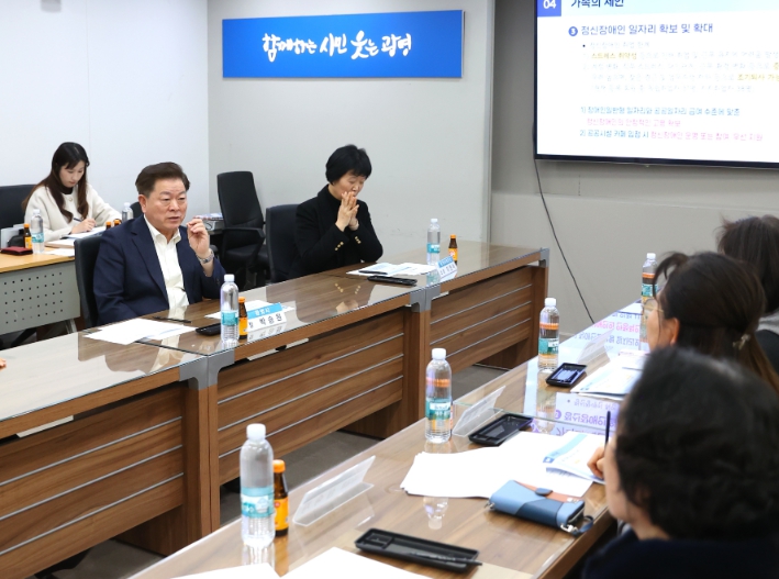 ![]() 박승원 광명시장이 지난 6일 시청 영상회의실에서 열린 중증정신질환자 가족 대표와의 간담회에 참석해 가족들의 건의사항을 경청하고 있다. |