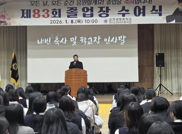 졸업생들을 향해서는 “중학교 3년은 설렘과 기대 속에 시작해 때로는 어려움과 고민을 마주하며 스스로를 돌아보고 성장해 온 소중한 시간이었다”라며 “그 모든 과정이 모여 오늘의 여러분을 만들었다”라고 격려했다.