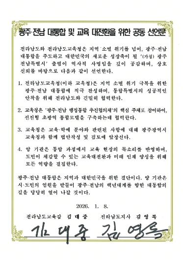 이와 함께, 전남교육청과 전남도는 통합 과정에서 교육 현장의 목소리를 반영하며, 교육 현장이 체감할 수 있는 교육 대전환과 미래 인재 양성을 위해 모든 역량을 결집한다는 데 합의했다.