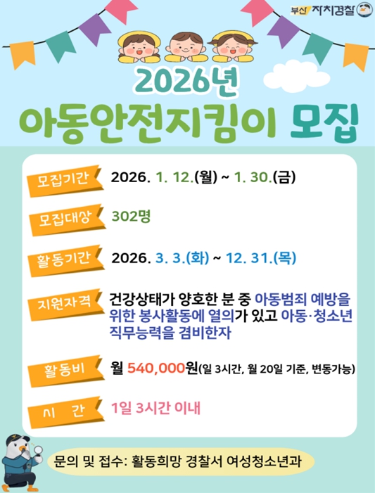 선발 예정 인원은 부산 16개 경찰서 총 302명으로, 지킴이 인원은 각 경찰서 관내 초등학교 수를 고려해 배분될 예정이다.